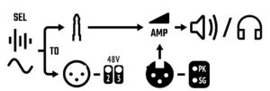 The Sound Bullet has an internal speaker which allows you to listen to balanced (XLR) or unbalanced (1/4″ Jack) outputs. The internal gain structure for balanced signals is designed to interact with line-level signals and won’t be sufficient to amplify microphones. Besides, due to the small internal battery, the Sound Bullet isn’t capable to generate 48V Phantom Power.
